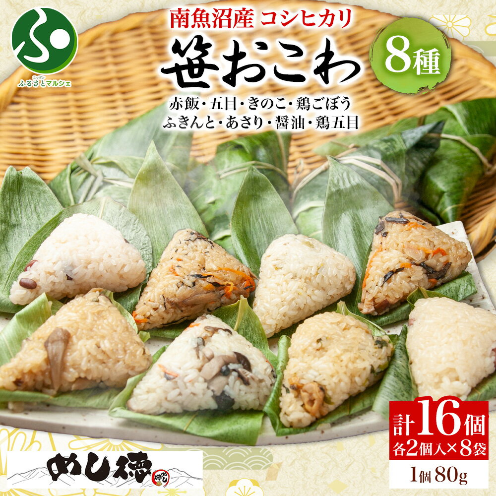 ▼新潟南魚沼産コシヒカリを使った笹おこわ8種!赤飯、五目、きのこ、鶏ごぼう、ふきのとう、あさり、醤油、鶏五目 16個セット♪