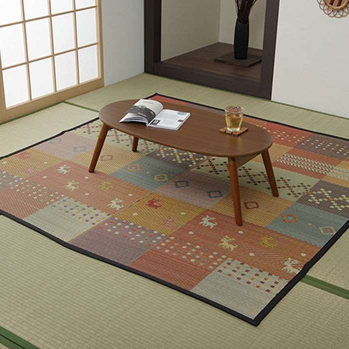 日本製のパッチワーク風い草ラグ。い草には空気の自然浄化作用、湿度の調節作用などがあります。抗菌防臭効果のあるヒバエッセンス加工を施しています。江戸間2畳サイズ。