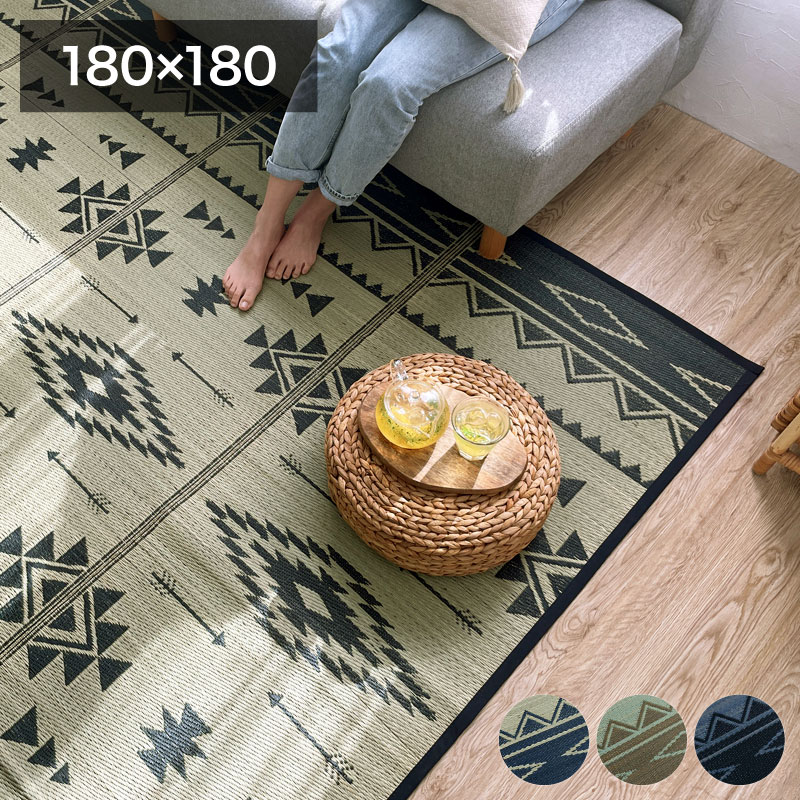 【送料無料】インテリア じゅうたん 洗濯不要 洗わないラグ 藺草 カーペット い草 ラグ 夏用 おしゃれ 涼しい 2畳 正方形 西海岸 インテリア 敷物 エスニック オルテガ 180×180