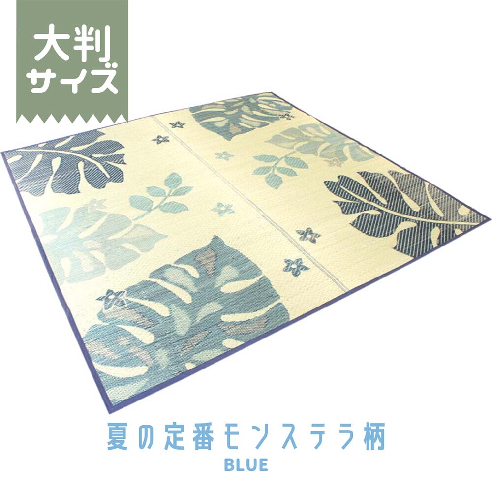 191x191cm(2畳用) ブルー色 い草大判ラグ「モンステラ -シユム- 」【裏貼加工】・・・