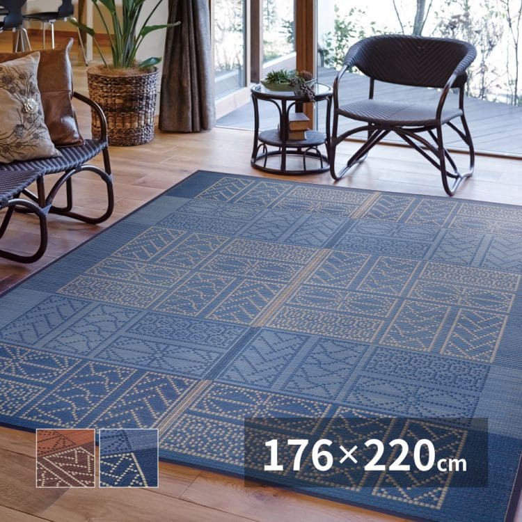 和モダンテイストのい草ラグ ウレタン入りでふっくらボリュームがあり はっ水加工付きで飲み物などをこぼしてもサッと拭きれて汚れにくい 裏面は滑り止め付きで安心