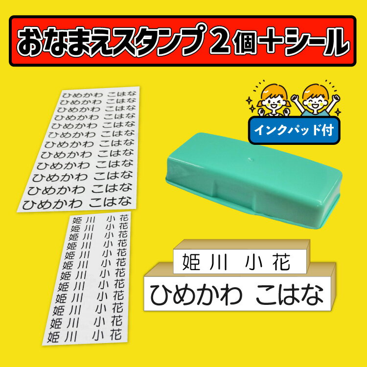 お名前スタンプお試しセット !お名前シール付き。4サイズから2個選べるお名前スタンプ+どこでもスタンプ台+お名前シールのセットです