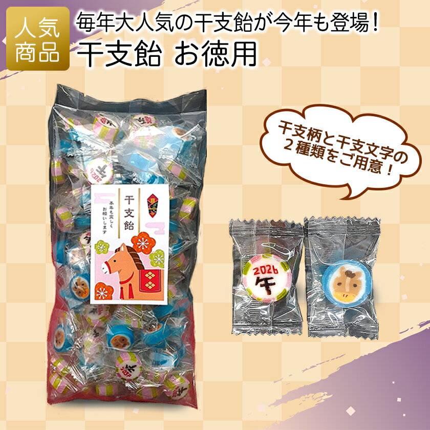 ほっこりする『うま』のお顔と干支文字の2種類をミックスした可愛い干支飴のお徳用袋です。 年越し用のイベント配布やちょっとしたギフトのラッピングアイテムとしても人気の商品です!