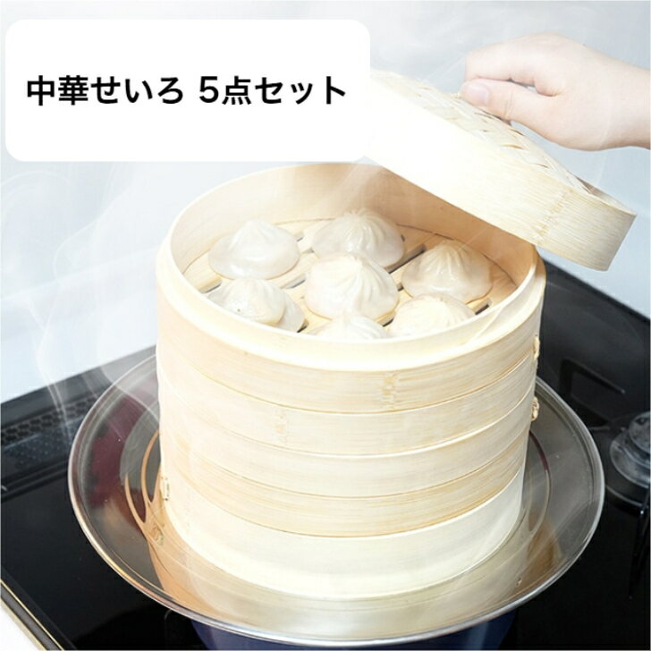 中華せいろ 5点セット 蒸篭 蒸し板 受け台 2段 蓋 フタ 天然 竹製 台輪 セイロ 直径21cm・・・