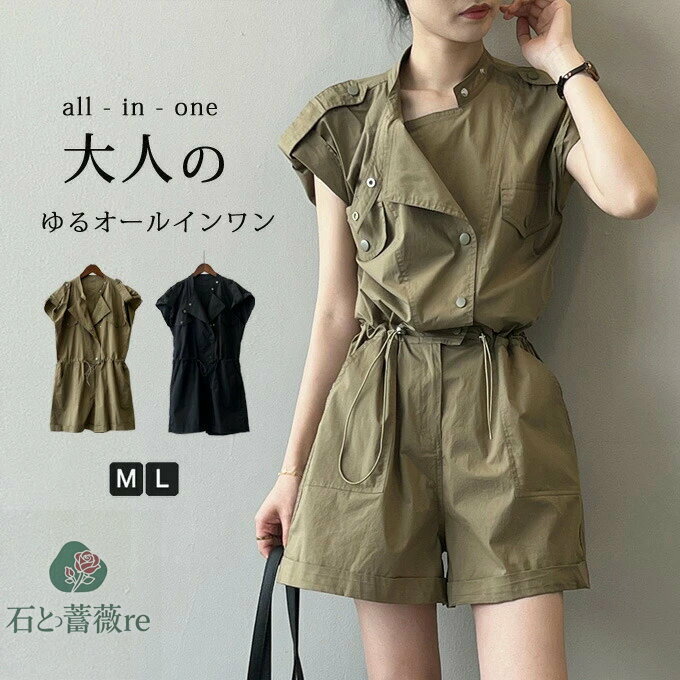 一枚で オシャレ完成~ 絶対かわいい~ 半袖オールインワンパンツ ベージュ ブラック 黒 春 夏 秋 体型隠し 着?せ カジュアル お洒落 20代 30代 40代 50代 送料無料 ♪
