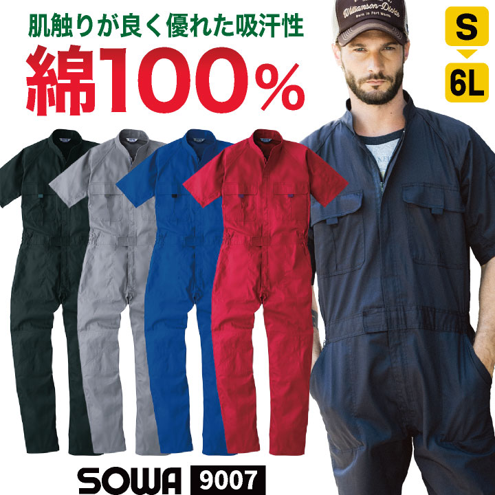 SOWA 9007 半袖つなぎ 豊富なサイズ展開! 肌触りが良く吸湿性のある綿100%素材。 アコーディオンプリーツで動きやすい。