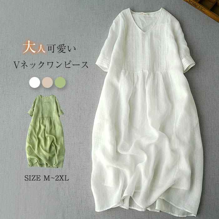 ワンピース レディース ロング丈 夏 半袖 コットン リネン 夏ワンピース ロングワンピース 半袖ワンピース つなぎ 無地 綿 麻 柔らか 涼しい vネック ナチュラル シンプル