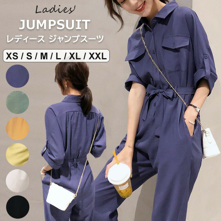 ジャンプスーツ ボトムス サファリジャンプスーツ レディース パンツ サロペット 半袖 無地 九分丈・・・