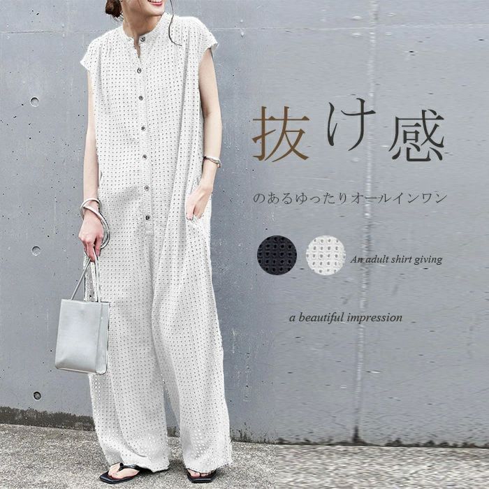 大人の オールインワン!つなぎ 半袖 透け感 夏用 抜け感のあるゆったりオールインワン ワイドパンツ 裏地づき