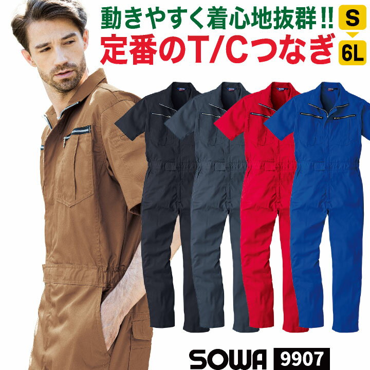 SOWA 9907 半袖つなぎ シワになりにくく乾きが速い、定番のT/C素材。 豊富なカラー展開と、アコーディオンプリーツで動きやすい。