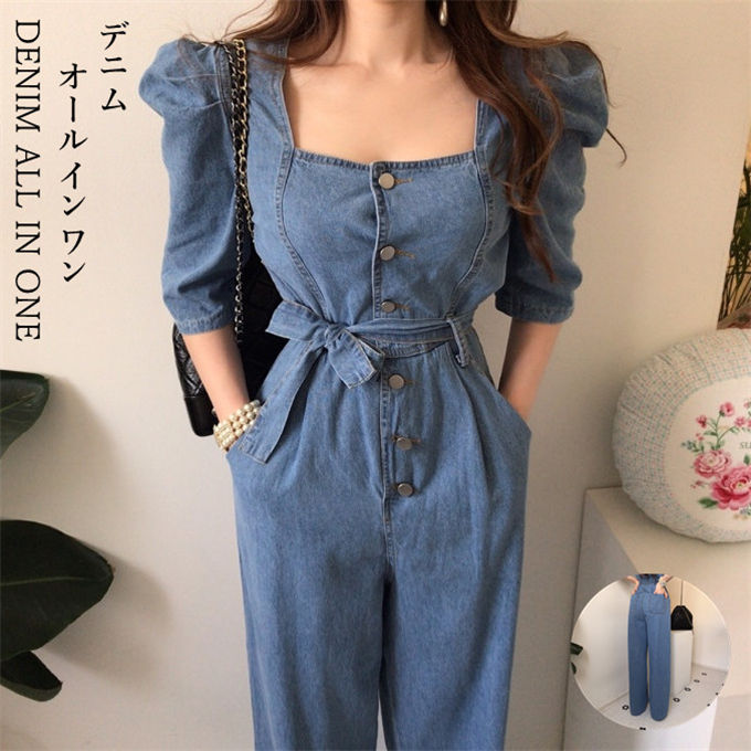 デニム オールインワン つなぎ ジャンプスーツ カジュアル ワークウェア レディース 無地 春 夏 半袖