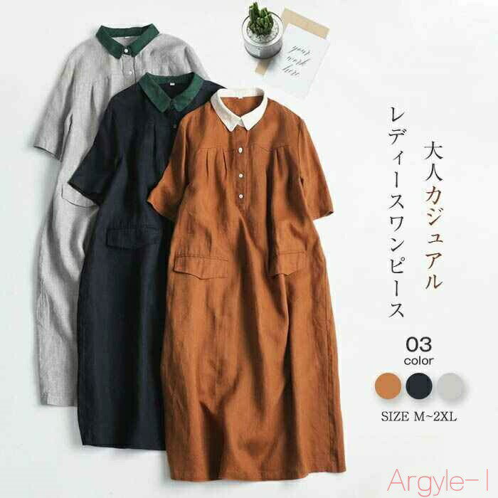 ワンピース レディース ミモレ丈 夏 半袖 コットン リネン 夏ワ