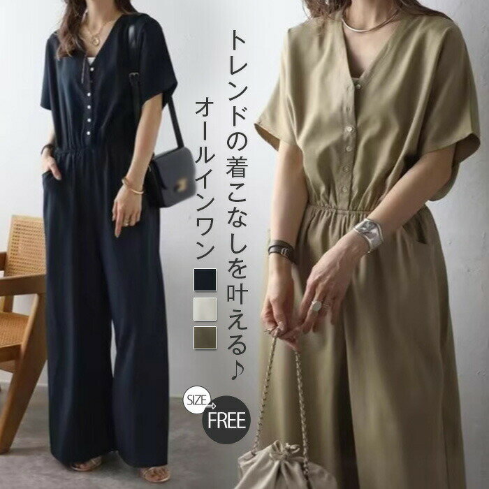 楽ちん~ 春夏に頼れる1枚 オールインワンパンツ ベージュ ブラッ