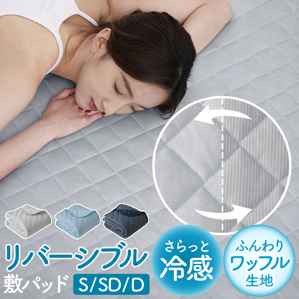 ひんやり&リバーシブル敷きパッド。さらっとしたひんやり面とふわふわのワッフル面があるので、季節ごとに使い分けられて便利。乾きやすいので、こまめにお洗濯できます♪