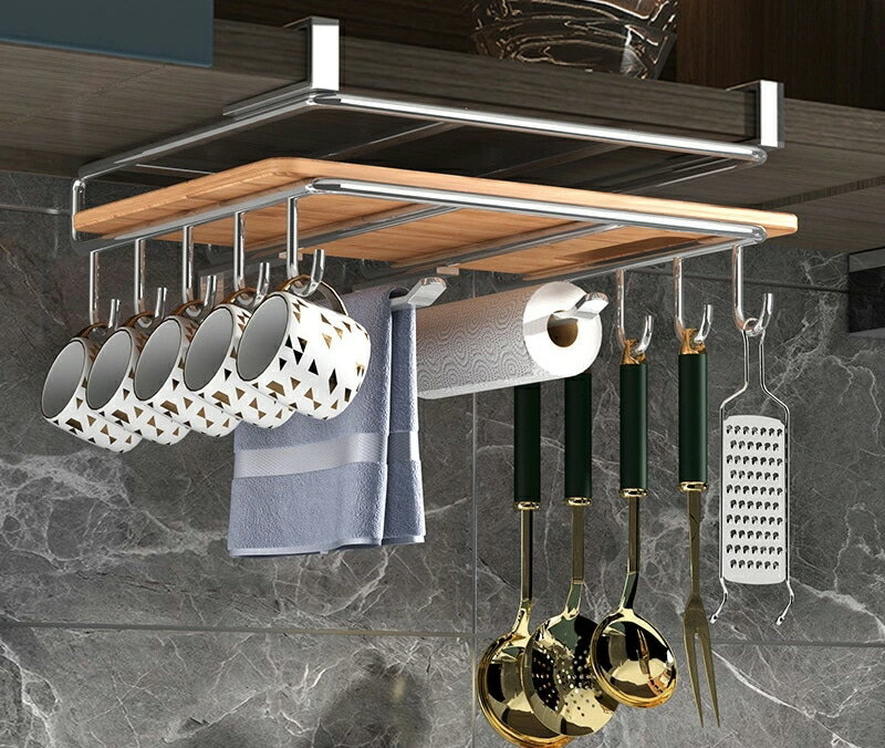 まな板スタンド 吊り下げラック 戸棚下まな板ホルダー 多機能収納 ふきん掛け 戸棚下ラック 調理器具収納 吊戸棚ストッカー スペース活用 キッチンペーパーホルダー 取り付け簡単