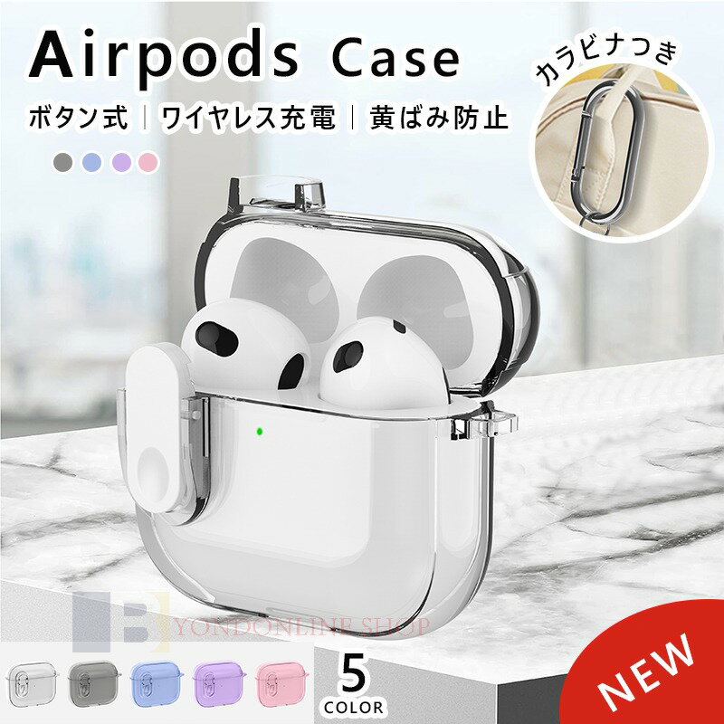 Airpods pro3 Airpods 4 ケース カバー ボタン式 カラビナつき ワイヤレス充電 耐衝撃 Airpods pro3 保護ケース クリア 透明 透明維持 エアーポッズプロ 3 保護カバー 第3世代 PC