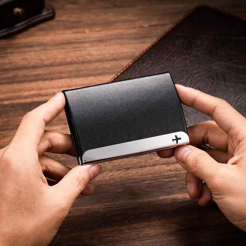 送料無料【5~10営業日以内に発送】名刺入れ メンズ 薄型 スリム 二つ折り 大容量 カードケース 合皮 PUレザー シンプル 無地 飛行機 ワンポイント ブラック 就職