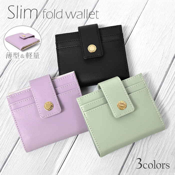 フェイクレザー スリム 二つ折り財布 小銭入れあり 小物 プレゼント 小さい 機能的 ミント ラベンダー ブラック 黒