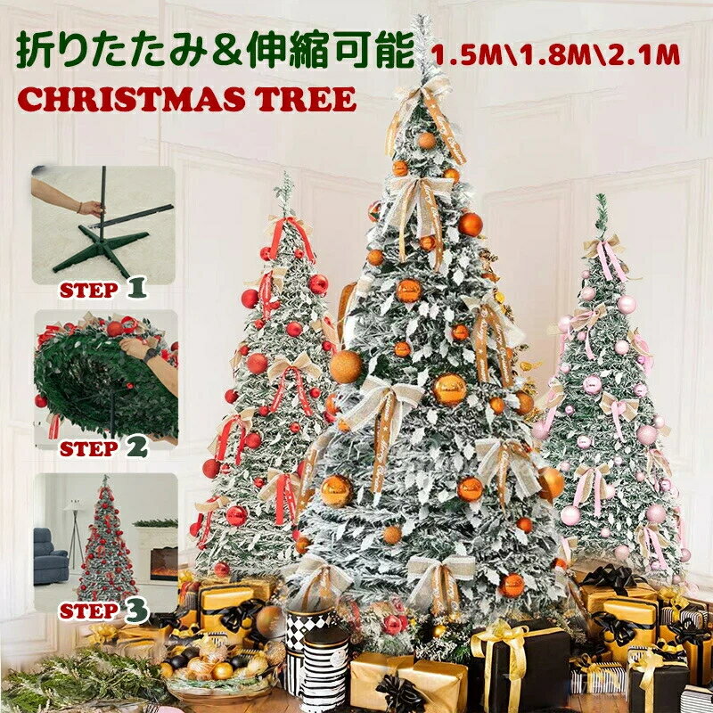 折りたたみ式で簡単設置、LEDライトと豪華オーナメント付きの伸縮式クリスマスツリー。自宅や店舗、商業施設の装飾に最適で華やかな雰囲気を演出。
