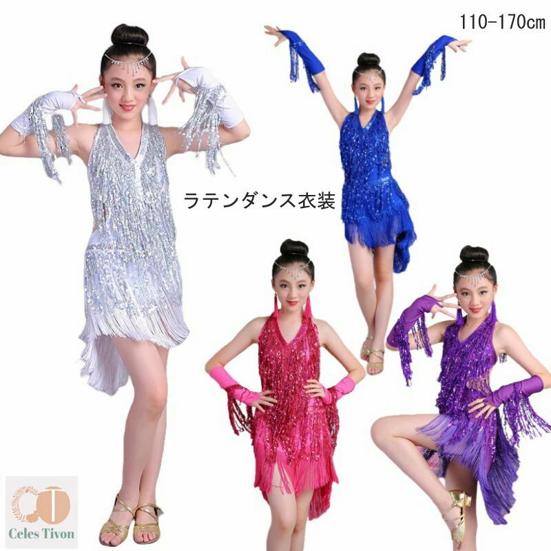 ラテンダンス衣装 キッズ ダンス衣装 スパンコール ワンピース 女の子 ドレス ジュニア 豪華セット・・・