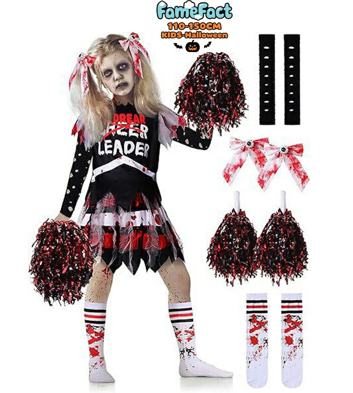 ホラー感たっぷりのゾンビチアガール衣装。血糊風デザインとポンポン付きで、ハロウィンやイベントにぴったり!可愛いけどちょっぴり怖い、写真映えも抜群の一着。