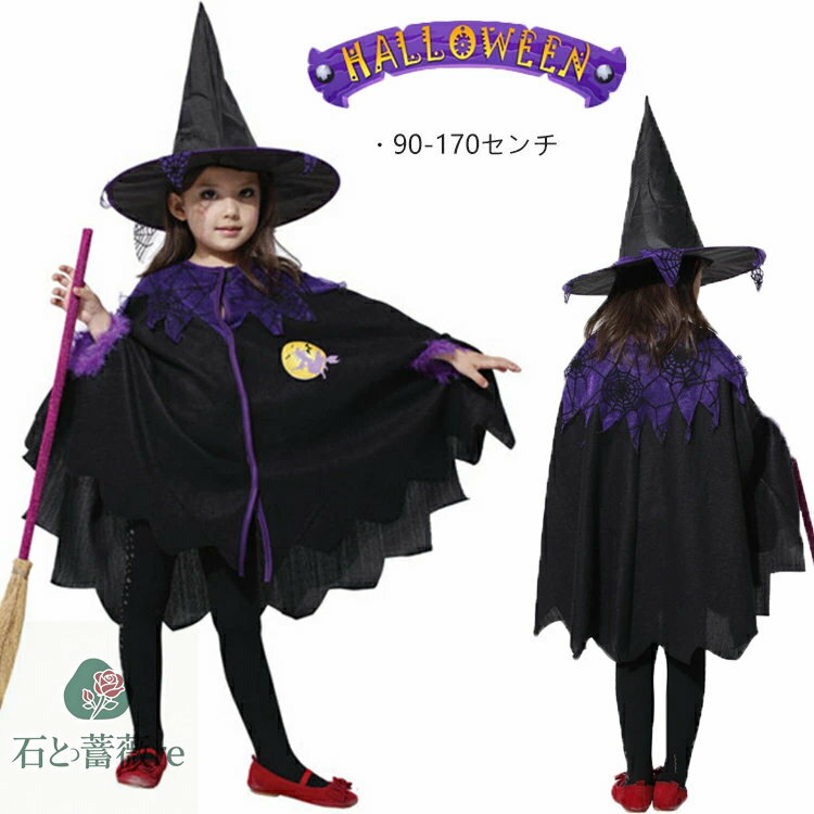 ハロウィン衣装 子供 魔女 コスプレ マント 帽子 2点セット 小学生 長袖 ワンピース パープル ・・・