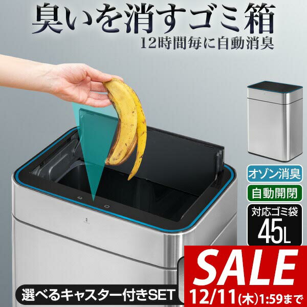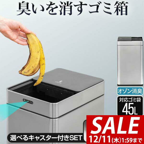 【選べるキャスター付きも】オゾンの力で消臭&除菌!人感センサーで自動開閉。45L袋対応。生ごみやオムツ等の臭いをカット。高さを抑えた中央開閉式。乾電池式で約3カ月稼働。スクエア型