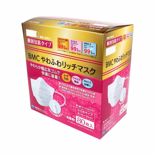 BMC やわふわリッチマスク 使い捨てサージカルマスク 個別包装 小さめサイズ 80枚入 送料無料・・・