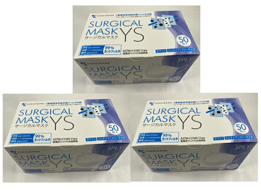 【50枚入 ×3箱セット送料込】横井定 サージカルマスクYS ホワイト 3層構造・フリーサイズのサー・・・