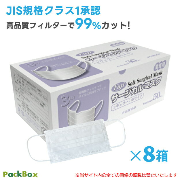 フジソフトサージカルマスク 不織布 医療用 ホワイト レギュラー 400枚入(50枚×8箱) 3層構・・・