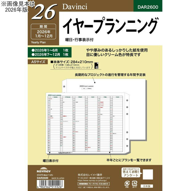 システム手帳 リフィル 2026年 A5サイズ イヤープランニング ダ・ヴィンチ DAR2600・・・