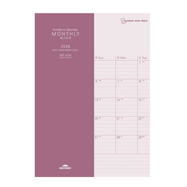レイメイ藤井 2026年 システム手帳 リフィル システムノートダイアリー ブロック日曜 A51ヶ月ブロック見開き1ヶ月