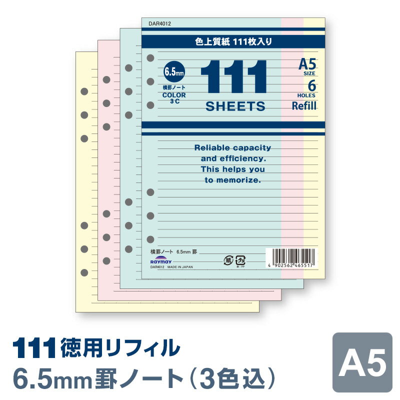 【システム手帳リフィル】徳用リフィル A5 6穴 横罫ノート(6.5mm罫)3色込(DAR4012)・・・