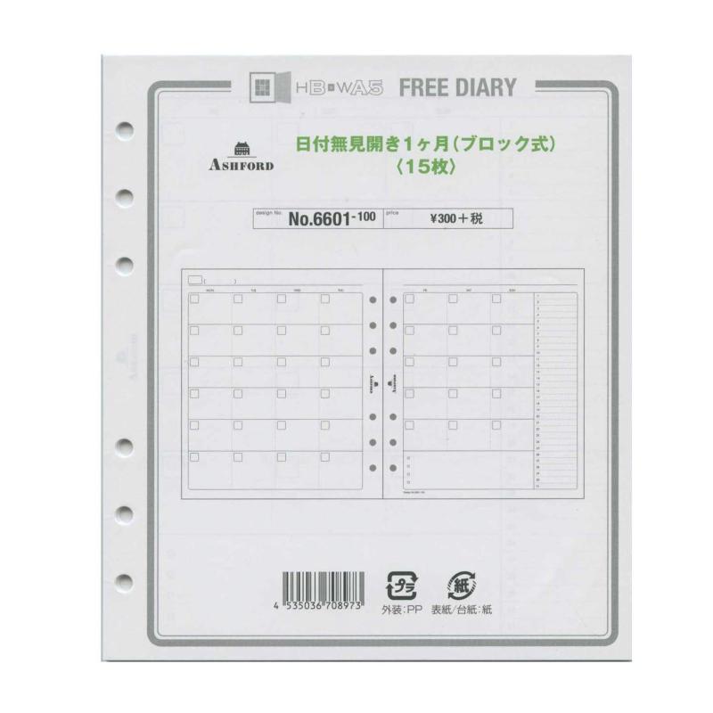 HB×WA5サイズ 日付無 見開き1ヶ月(ブロック式・15枚)システム手帳リフィル 6601-100・・・