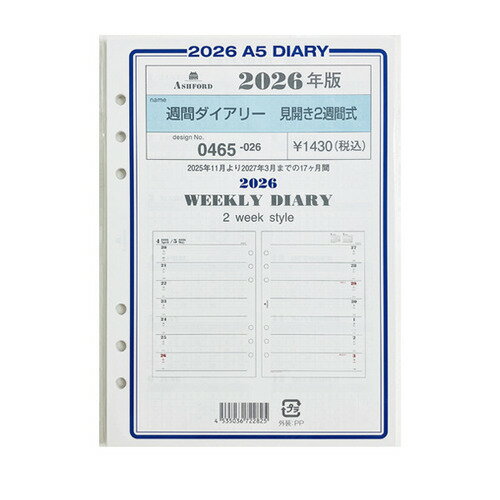 【2025年11月始まり】 アシュフォード(ASHFORD) 週間ダイアリー(見開き2週間式) A5・・・
