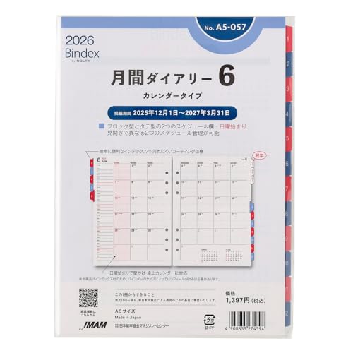 能率 バインデックス システム手帳 リフィル 6穴 2026年 A5 マンスリー カレンダータイプ ・・・