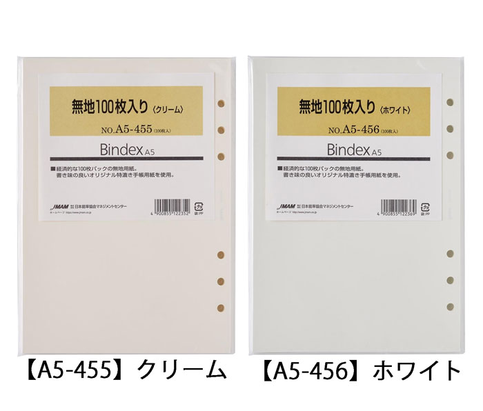 A5サイズ システム手帳用リフィル 無地100枚入り【クリーム:A5-455/ホワイト:A5-456・・・