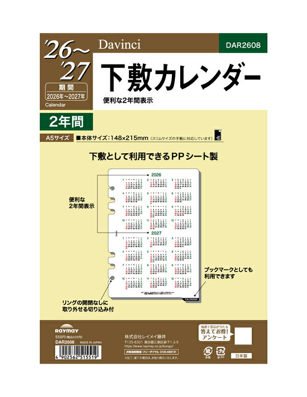 2026年版 A5サイズ レイメイ Davinci 2026〜2027年下敷カレンダー リフィール【・・・