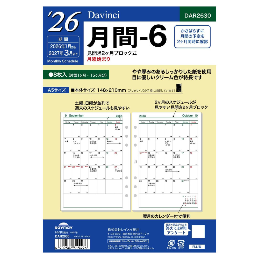 【メール便対応可能】DAR2630レイメイ藤井 ダ・ヴィンチ リフィル A5サイズ 2026年月間-・・・