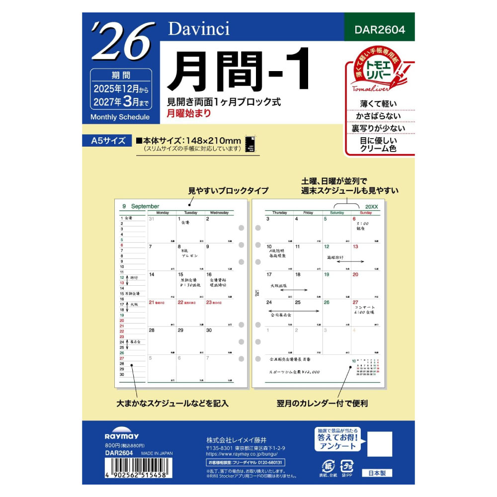 レイメイ ダヴィンチ ダ・ヴィンチ リフィル A5 月間-5 DAR2648 マンスリー 月間 ブロック 月曜 始まり 2026年 2026 スケジュール ダイアリー システム手帳 バインダー