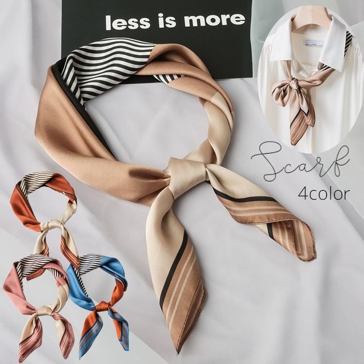 上品な正方形シルクタッチスカーフ。日焼けからおしゃれに守るエレガントな大判スカーフ。バッグに巻いたり、ヘアアクセントにも最適。