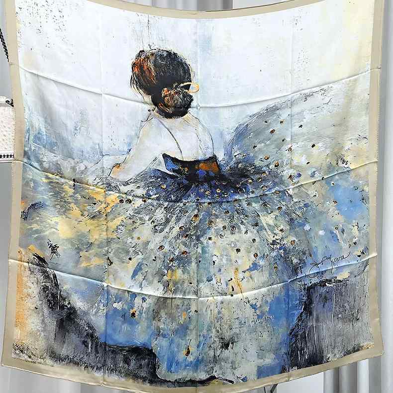 スカーフ レディース シルク100% サテン UVカット 油絵風 バレリーナ 柄 レトロ 大判 正方・・・