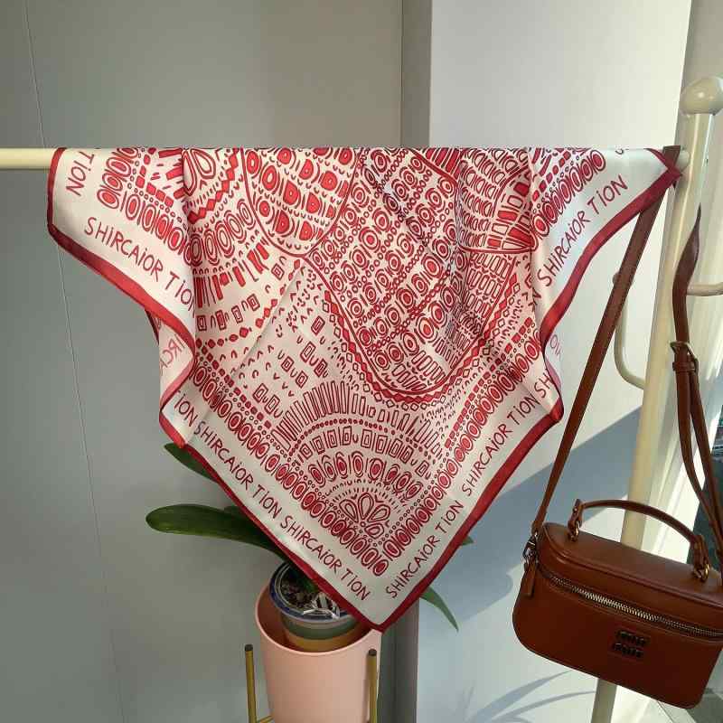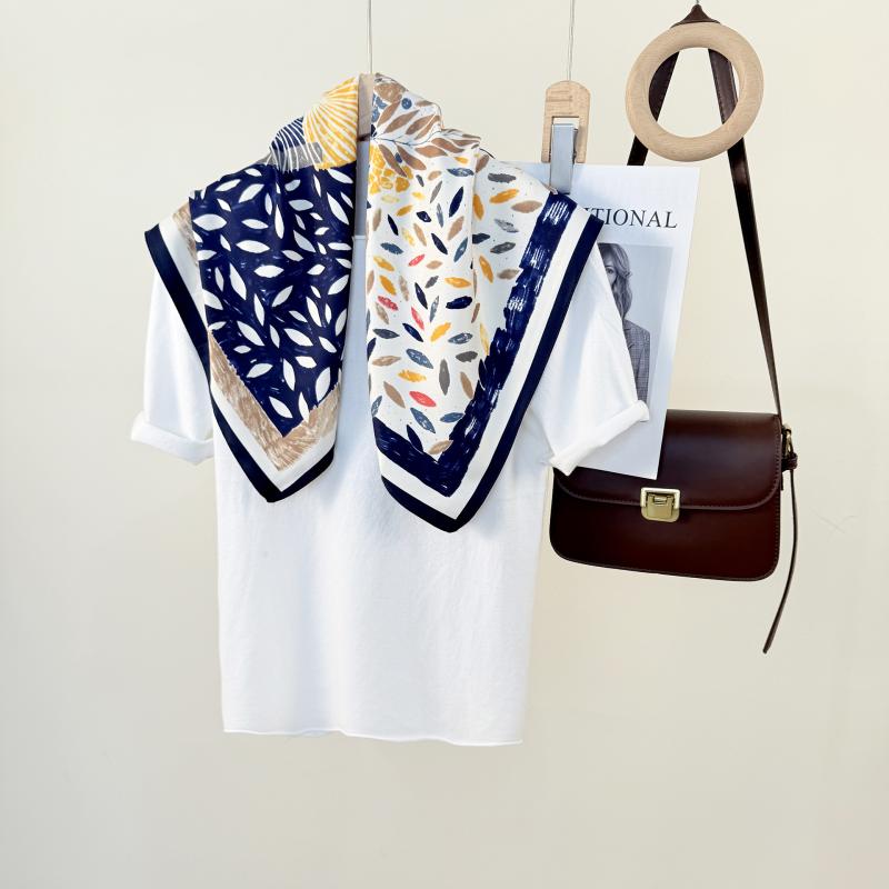 上品な正方形シルクタッチスカーフ。日焼けからおしゃれに守るエレガントな大判スカーフ。バッグに巻いたり、ヘアアクセントにも最適。