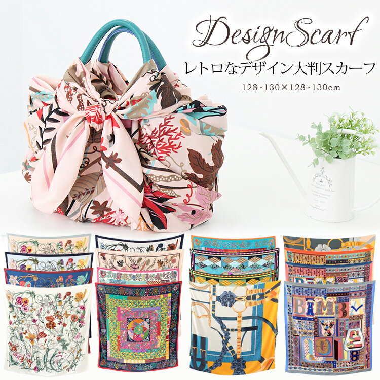 シルクタッチの上品な大判スカーフ、日焼け対策や冷房対策に。デザイン豊富でおしゃれな風呂敷としても、旅行時のコーディネートに活躍。