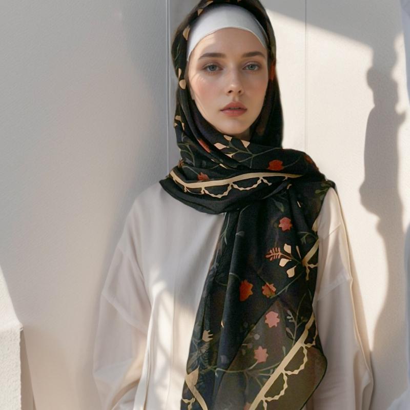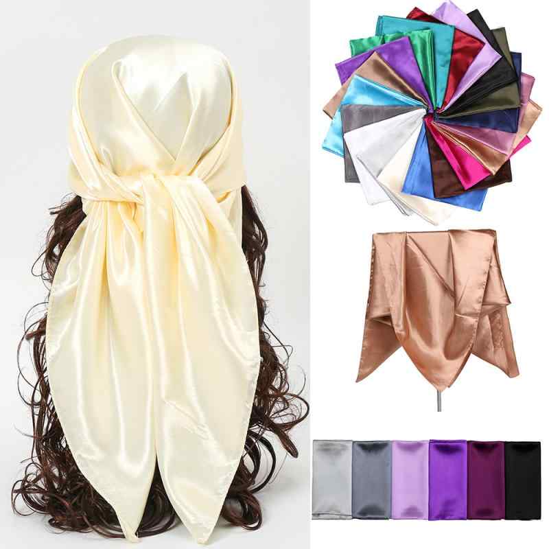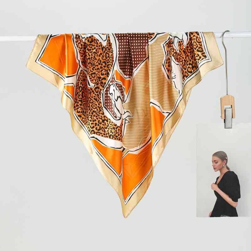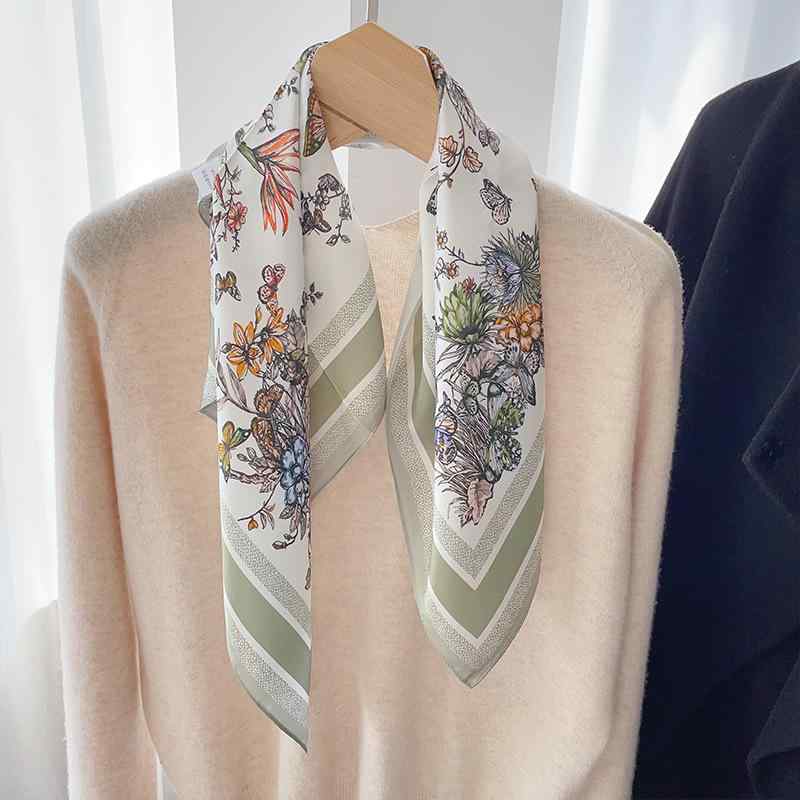 上品な正方形シルクタッチスカーフ。日焼けからおしゃれに守るエレガントな大判スカーフ。バッグに巻いたり、ヘアアクセントにも最適。