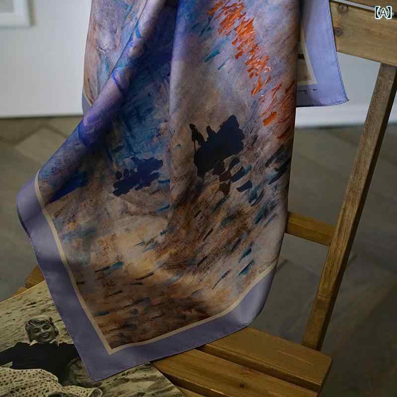 正方形スカーフ レディース シルク サテン 油絵風 アート柄 レトロ 個性的デザイン 大判 上品 エ・・・