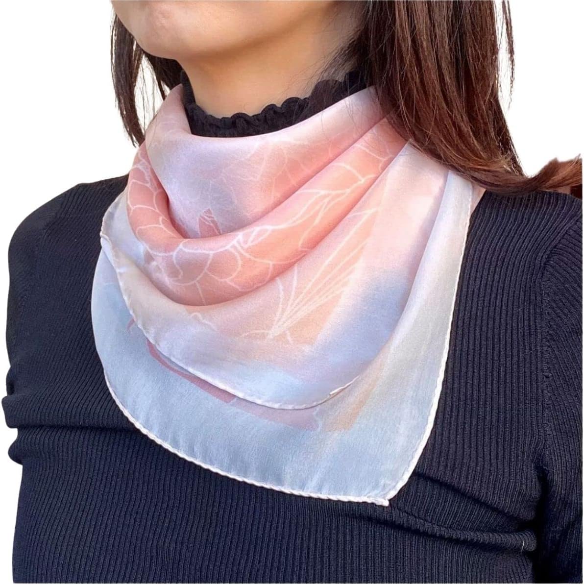 正方形の大判スカーフ。多彩なスタイリングでお洒落を演出する万能アイテム。