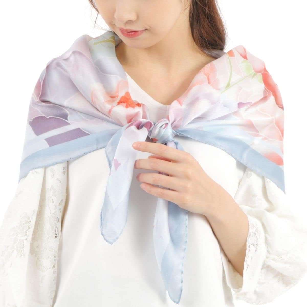 シルク100%証明書取得済。極上の天然素材、シルク100%のスカーフ。日焼けや冷房から華やかに守り、バッグや髪にエレガントなアクセント。