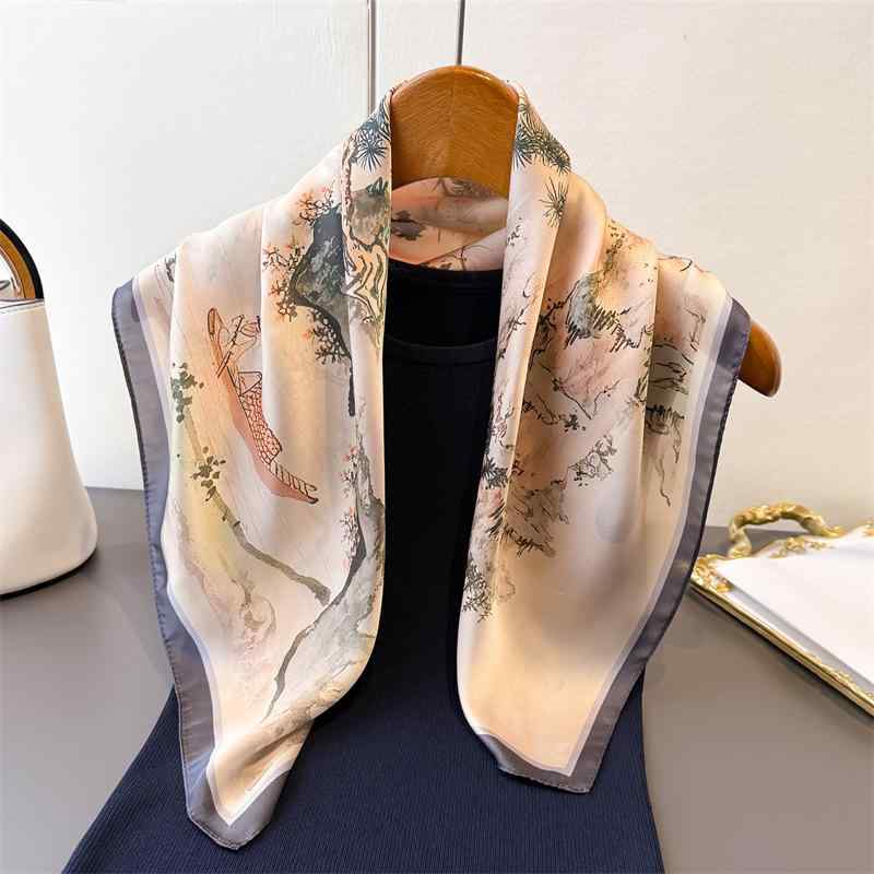 スカーフ レディース UVカット 首元保護 保温 冷房対策 シルク調 70cm 大判 正方形 水墨画・・・