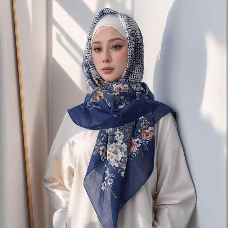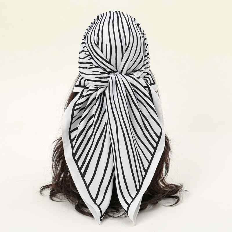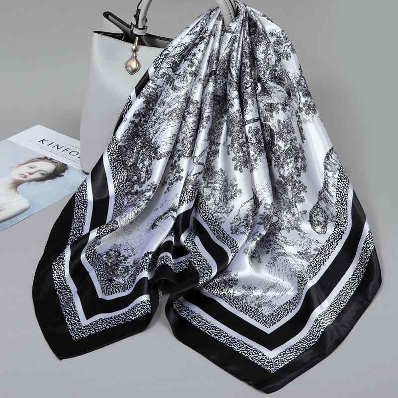 上品な正方形シルクタッチスカーフ。日焼けからおしゃれに守るエレガントな大判スカーフ。バッグに巻いたり、ヘアアクセントにも最適。